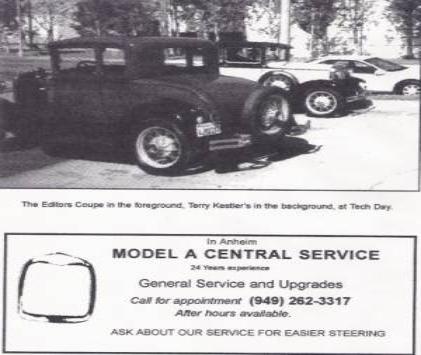 | After many years, it was an absolute thrill to get my Model A on the road. Except for a few short trips around my area, to get the "bugs" out, I finally drove it some distance, to the Tech Day at Santa Fe Springs, on Sunday the 30th of April. It was a very exciting experience. The "A" ran great! of course I have a lot to do yet, but to experi- ence the excitement, joy & pride I felt, was worth all the frustration & work of bring- ing the car "back from the dead" The Model A is fun to drive, but it sure makes you appreciate power steering, air conditioning and all the other luxuries we have in our "modern iron". There are so many people I have to thank for helping and encouraging me in my restoration process. I know I'll leave soneone out, but I must thant all of those I can think of. A big thank you to: Jake Thomas, Wayne Switzer, Richard Flores, Norm Pickell, Bill Van Lowen B.J. Wellington, Terry Kestler, Cal Chesbrough, Bud Bartlett, |